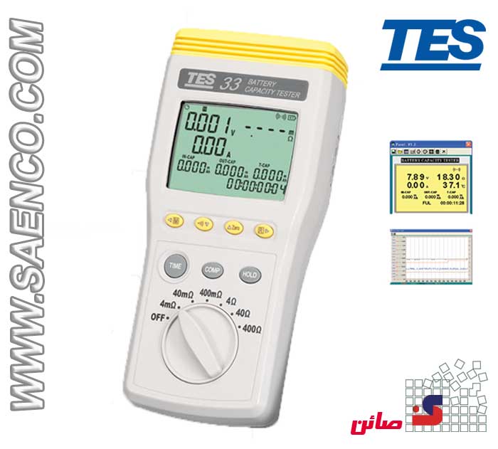 تستر ظرفیت باتری TES-33، تجهیزی مناسب جهت بررسی و آنالایزر ظرفیت انواع باتری (آلکالاین، لیداسید و باطریهای فشرده، باطریهای ثانویه، باطری Nickel –Cadmium، باطری لیتیومی و باطری (NiMH) ) میباشد. تستر باتری TES-33 قابلیت اندازه گیری، مقاومت داخلی تا 400 اهم، ولتاژ تا 60 VDC ، جریان حدوداً 40mA~4µA و دما یا درجه حرارت باتری 60~-20-ċرا دارد. با استفاده از کلمپ جریان میتوان ظرفیت برحسب mAH و AH برای شارژ و دشارژ مشاهده نمود. با ثبت مقادیر ولتاژ و مقاومت مطلوب میتوان وضعیت باتری ها را بررسی نمود و بصورت نتیجه کیفی " Pass، Fail، Warning" نمایش داد. نمایش همزمان مقادیر اندازه گیری شده بدون نیاز به خاموش کردن باطری ( تست آنلاین) از بارزترین ویژگی باتری تستر TES-33 میباشد. ثبت اطلاعات تا 6000 مورد از خصوصیات ظرفیت سنج باتری TES-33 میباشد و میتوان نتایج را توسط کابل USB به رایانه یا لپتاپ منتقل نمود. از دیگر ویژگی های این باطری تستر، اندازه گیری 4 ترمیناله برای اندازه گیری دقیق پارامترها، تابع مقایسه گر، امکان اندازه گیری توسط پراب سوزنی یا گیره ای، کلمپ برای اندازه گیری راحت تر جریان، سنسور دما برای اندازه گیری دمای باتری و... میباشد.